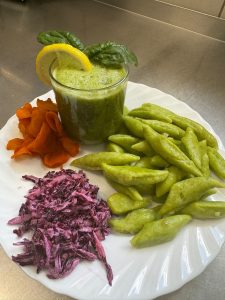 Dziś wszystko było zdrowe, kolorowe i pełne witamin! Na talerzach pojawiły się zielone kopytka z groszku, pyszne marchewkowe chipsy, kolorowa sałatka z czerwonej kapusty oraz orzeźwiające zielone smoothie z owoców i warzyw. 🥬🍋🥕