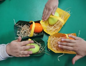 Na zielonym stole cztery papierowe koszyczki z żółtym papierowym paskiem. W koszyczku słoma, na niej plastikowe jaja: dwa pomarańczowe, dwa żółte. Dłonie dzieci nad trzema koszyczkami.